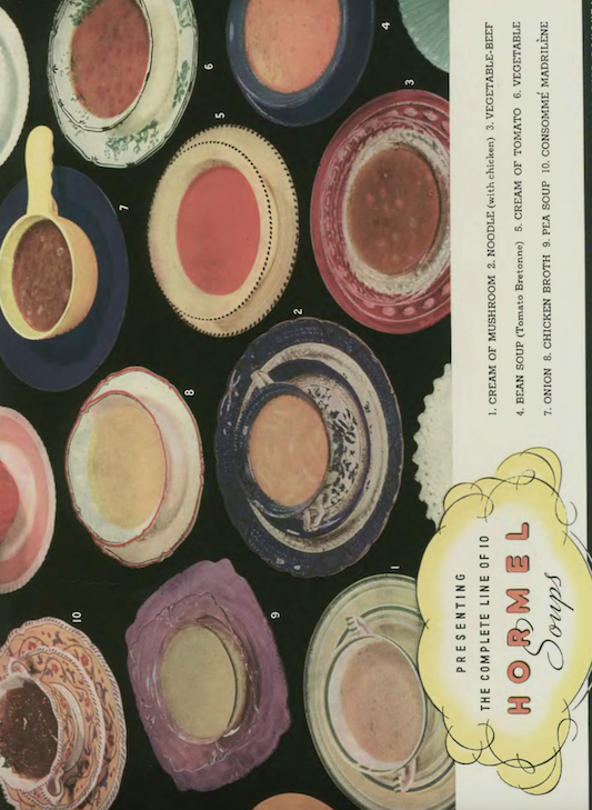 The folks at Hormel once again claimed the inside front cover with this array of soups featured sideways, in full color…