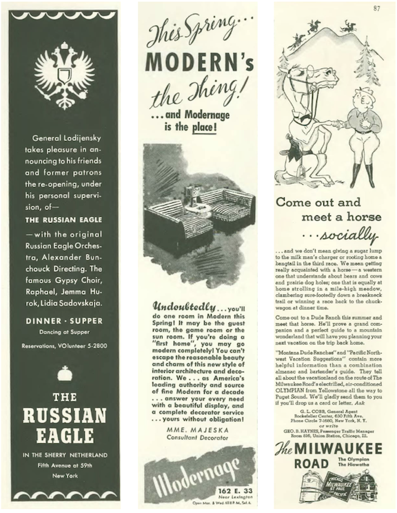 …a sampling of one-column ads featured, from left, the renowned Russian Eagle cafe-bar at the Sherry-Netherland, the Modernage furniture store on East 33rd, and the Milwaukee Road railroad, which offered adventure at such places as a Montana dude ranch…