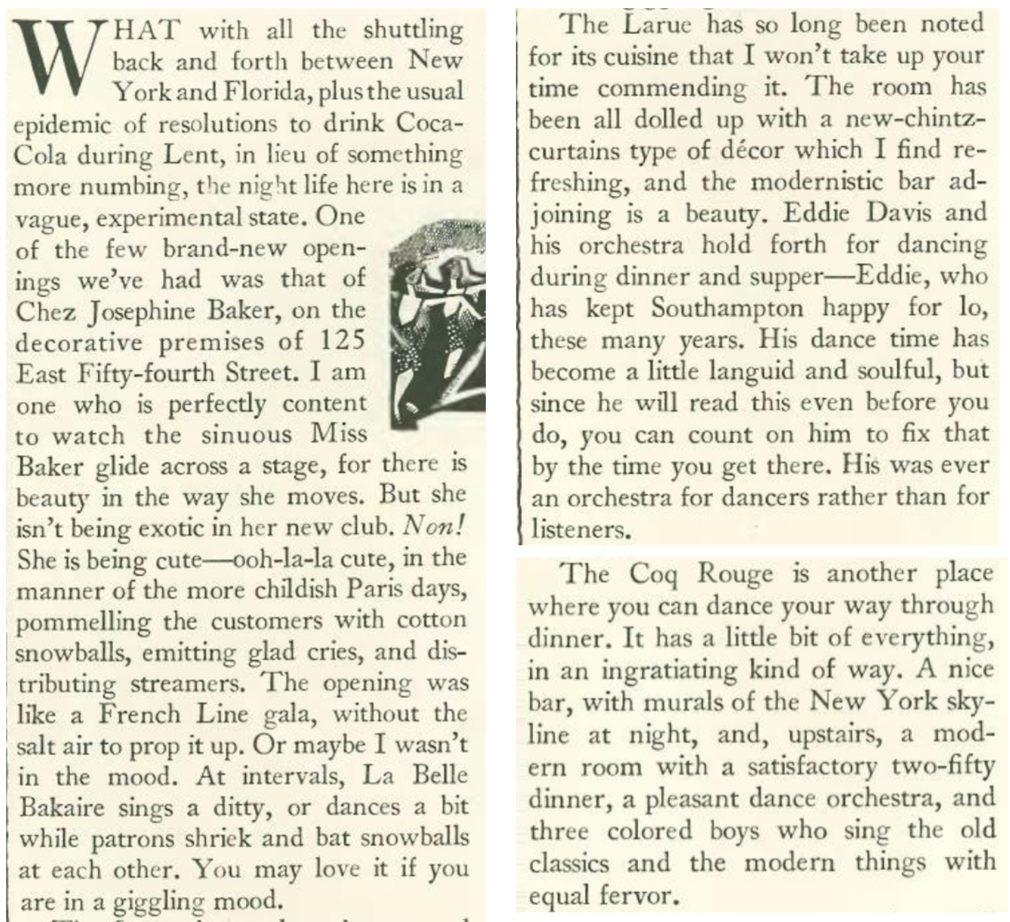 In her “Tables for Two” column headlined “Nostalgic Notes,” Long checked out the new Chez Josephine Baker, the garden-like delights of Restauarnt Larue, and the French-themed Le Coq Rouge.