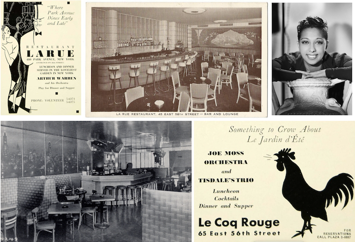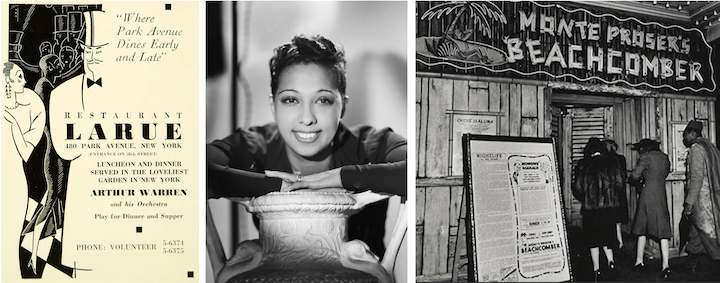 Above: Nightlife correspondent Lois Long checked out the latest clubs as well as old-time favorites in her column "Tables for Two." From left, advertisement for Restaurant Larue; Josephine Baker in 1937; and the entrance to Monte Proser's Beachcomber, an early iteration of the tiki bar that would become ubiquitous in midcentury America. (eBay.com/Wikipedia/mytiki.life)