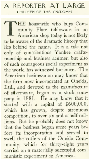 This polyamorous Christian utopia disbanded before the end of the 19th century and reemerged as a joint-stock company, Oneida Community Limited, which focused on making silverware. This brief excerpt is from the first paragraph.