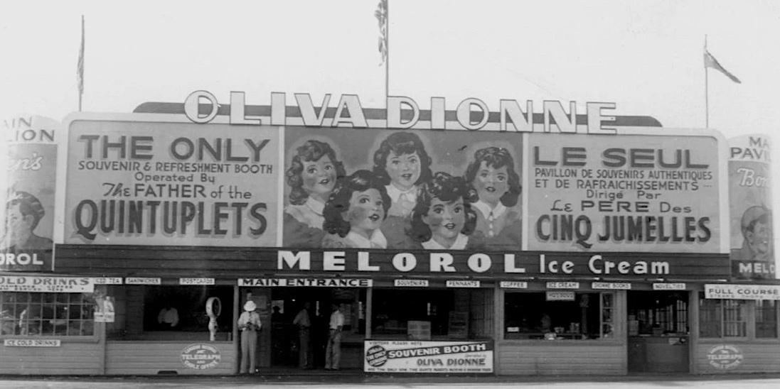 The Dionne Quintuplets were used to endorse an array of products including Quaker Oats, Colgate toothpaste, Palmolive soap, and Lysol disinfectant. Dr. Dafoe became a wealthy man due to his association with the quintuplets, while the government of Ontario saw enormous tourism potential (the girls were made wards of the province ostensibly to protect them from exploitation). At the age of four months the quintuplets were moved from the farmhouse where they were born to a compound (“Quintland”) that featured an outdoor playground designed as a public observation area.