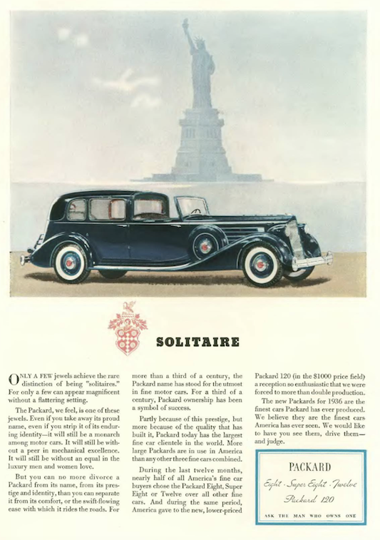 …American luxury carmaker Packard proudly displayed their twelve-cylinder luxury model, but reminded readers they could have a lesser model, the 120, for a price “in the $1,000 field”…