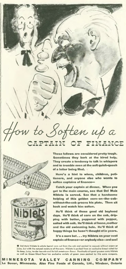 …if you have been following this blog, you’ll recall the ads with angry duchesses fuming over tomato juice and rich old men fondly recalling their countrified youth via canned corn niblets…well here is one robber baron who needed some niblets pronto to quiet his rage…maybe a snifter or two of brandy would have also helped…