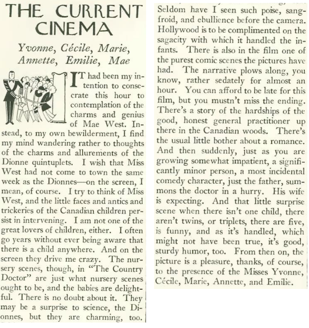The Country Doctor was the first of three 20th Century Fox films featuring the toddlers as the “The Wyatt Quintuplets.” Actor Jean Hersholt played the country doctor (“Dr. John Luke”) in all three films, his character based on Allan Roy Dafoe, the Ontario obstetrician who successfully delivered the identical quints in 1934. It was a sign of the times that no one seemed too concerned about the children’s welfare—The New Yorker’s John Mosher was joined by his fellow critics in generally praising the film.