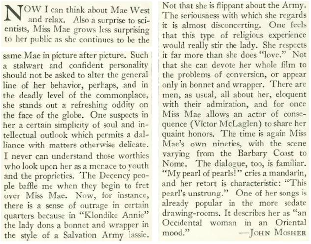 John Mosher also reviewed Mae West’s latest film, Klondike Annie. Some critics regarded it as her finest film, despite heavy censorship and the outrage of “Decency people.”