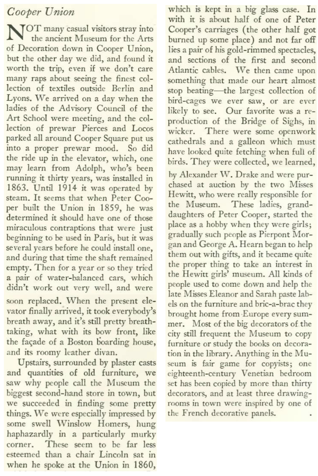 “The Talk of the Town” paid a visit to the Museum for the Arts of Decoration at the Cooper Union and found many treasures within, including a unique circular elevator.