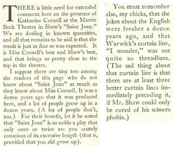 Robert Benchley found Katharine Cornell’s theatrical performance in Saint Joan to be “as fine as was expected.” An excerpt: