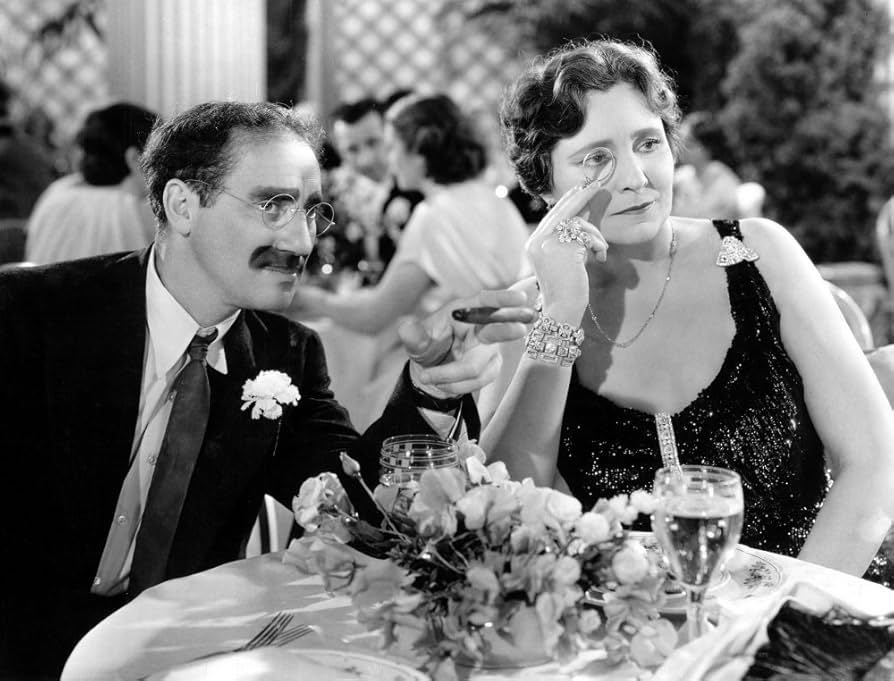Above: Margaret Dumont with Groucho, Chico and Harpo Marx in A Night at the Opera. A trained operatic singer, Dumont portrayed wealthy, regal women as comic foils to the Marx Brothers in seven of their films. Groucho once referred to her as "the fifth Marx brother." (Britannica.com)