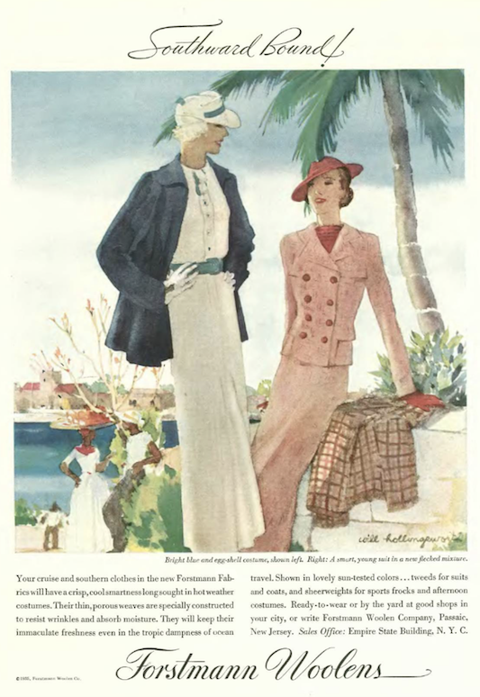 …Forstmann Woolens switched gears, replacing their lovely seasonal ads (featuring fall and winter fashions) with the latest in tropical togs…
