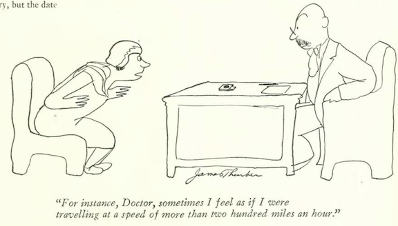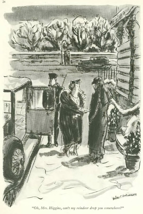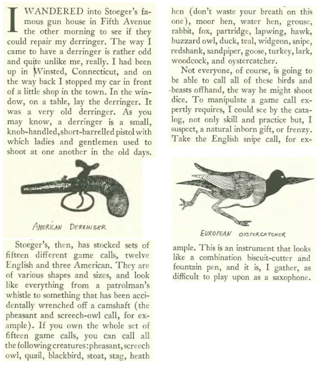 James Thurber was also facing the challenges of the modern world, being the unlikely owner of a very old derringer and hoping to possibly get it repaired. He stopped in at Stoeger’s gun store on Fifth Avenue, where a salesman tried to sell him a newer model. Instead, Thurber opted for a copy of the catalog (which he found fascinating), and pondered the store’s various game calls, which he thought might make suitable holiday gifts. Some brief excerpts: