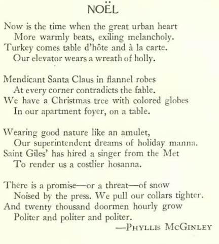 This poem comes courtesy of Phyllis McKinley (1905–1978), a children’s author and poet who lovingly satirized her suburban life, publishing in both popular as well as literary magazines, including The New Yorker.