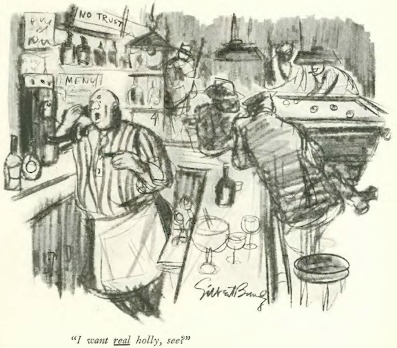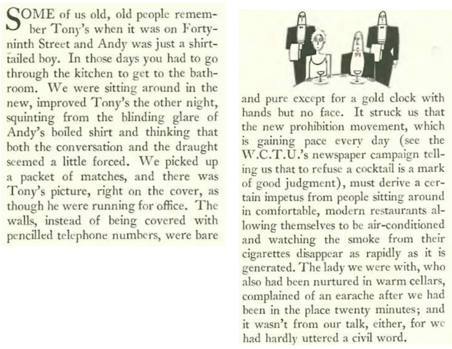 In his “Notes and Comment,” E.B. White recalled the good old days at a place called Tony’s on 49th Street. I couldn’t find any record of the place (or images), but apparently the new Tony’s lacked the smoke-filled charm of the original. Not to mention that the air-conditioning gave an earache to one of White’s acquaintances: