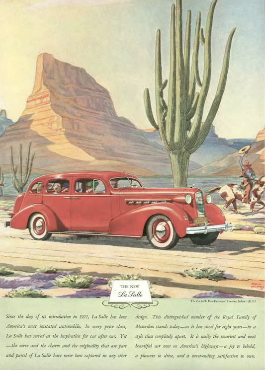 …even the makers of the La Salle (Cadillac) were feeling the warmth with this image of the sunny Southwest (this was the left panel of a two-page spread)…