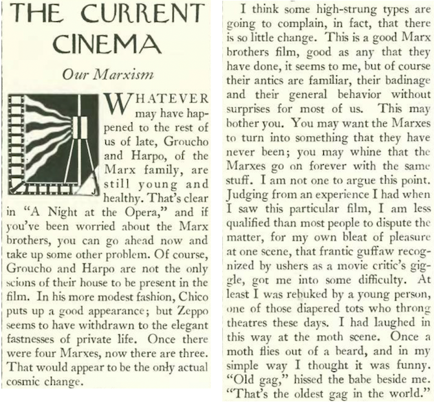 With their move from Paramount to MGM, Groucho, Chico and Harpo Marx launched a new style of comedy with A Night at the Opera, one of 1935’s biggest hits. Critic John Mosher was pleased to see the trio’s familiar antics on the screen, but with more story structure than their previous films.
