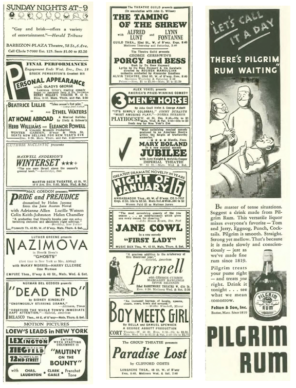 …back of the book, single-column ads featured delights of the stage and screen and an appeal for Pilgrim Rum aided by the talents of William Steig…
