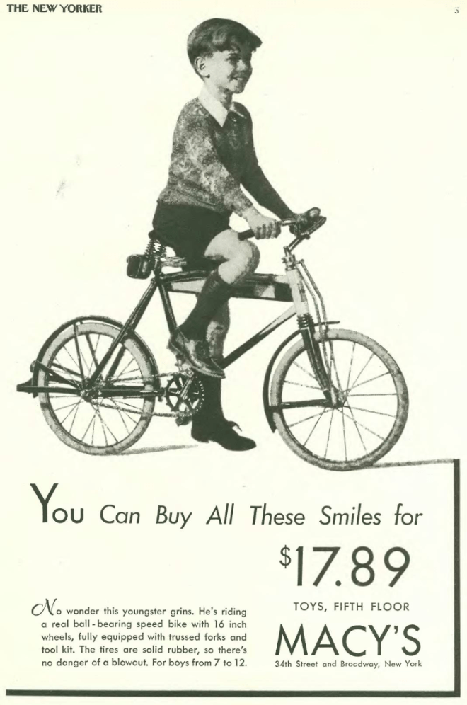 Many advertisers played to the Anglophilic tendencies of New Yorker readers, particular ones selling garments to the sporting gentry who aped their British cousins in such pursuits as polo and dressage…here we have “play clothes” from the menswear company Rogers Peet…