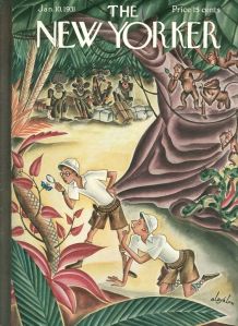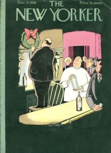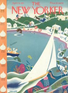 April 23, 1932 cover by E.B. White. Although White’s friend and early office mate James Thurber had been contributing drawings for more than a year, it was White who would land the first cover—his only one (Thurber’s first cover would come in 1936). Maria Popova (brainpickings.org) shares this excerpt from a 1969 Paris Review interview, during which White explained to George Plimpton: “I’m not an artist and never did any drawings for The New Yorker. I did turn in a cover and it was published. I can’t draw or paint, but I was sick in bed with tonsillitis or something, and I had nothing to occupy me, but I had a cover idea—of a sea horse wearing a nose bag. I borrowed my son’s watercolor set, copied a sea horse from a picture in Webster’s dictionary, and managed to produce a cover that was bought. It wasn’t much of a thing. I even loused up the whole business finally by printing the word ‘oats’ on the nose bag, lest somebody fail to get the point.”