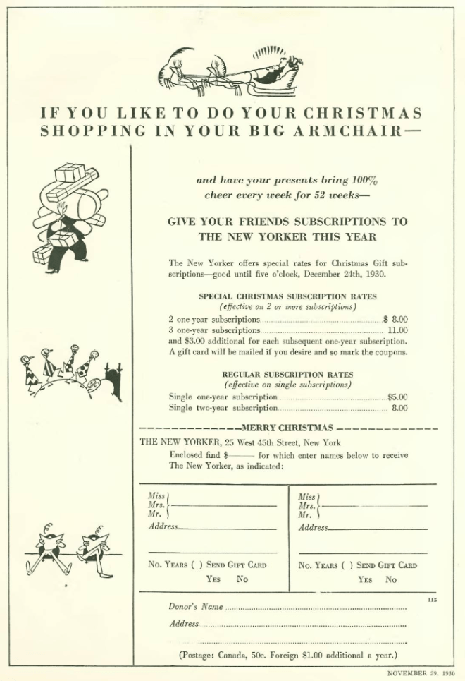 …despite the Depression, New Yorker subscriptions continued to steadily increase — the magazine had nearly 45,000 subscribers in 1930, and by the end of the decade the number would approach 100,000 — below, a house ad designed to entice new subscribers…
