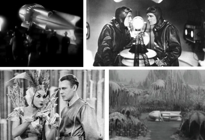 MARS ATTACKS…The film also took audiences to the surface of Mars via a phallus-shaped spaceship that would later be used in Flash Gordon serials. Clockwise, top left, the spaceship blasts off surrounded by a crowd of men in fedoras; aboard the spaceship; landing site on Mars; J-21 (John Garrick) encounters the Martian Queen (Joyzelle Joyner). (YouTube/scifist.net)