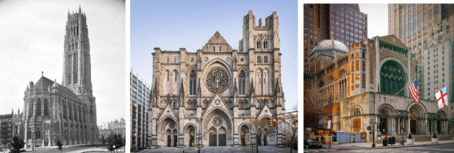LANDMARKS ALL…From left, Riverside Church, the still yet-to-be completed St. John the Divine, and St. Bartholomew’s. (MCNY/masonrymagazine.com/dtjoyce.com)