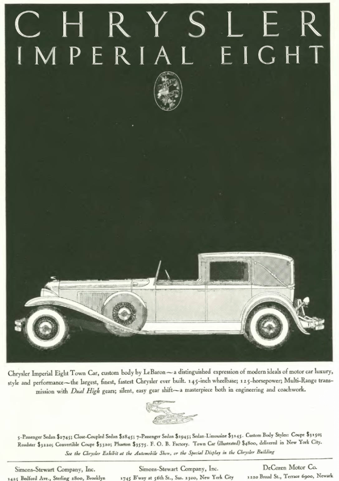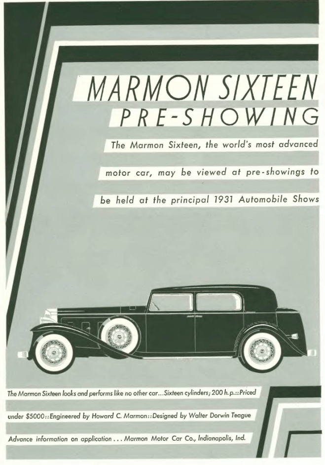 …we segue to our advertisements, many from car companies touting their displays at the New York Automobile Salon. Like REO, Marmon was noted for various innovations, including the introduction of the rear-view mirror. It also manufactured a stunning 16-cylinder automobile that was on display at the 1931 Salon. But also like REO, the Depression proved too much for Marmon, and it was defunct by 1933…
