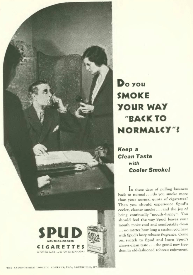 …so let’s say the Depression has wiped you out and you can’t even afford an Essex…well you could try to “smoke your way back to normalcy”…