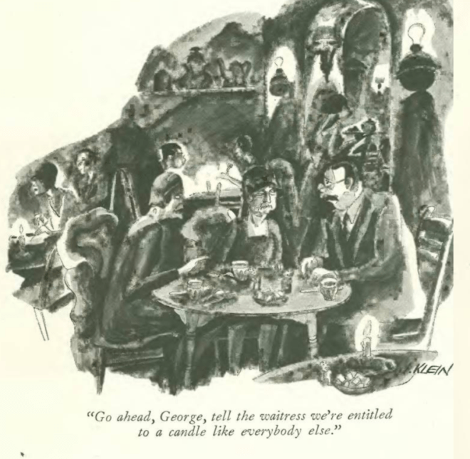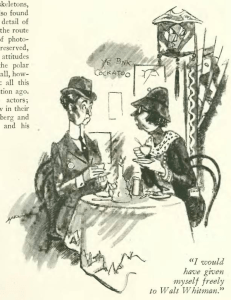 Lois Long aka “Lipstick” turned in yet another “Tables for Two,” even though she had abandoned that column as a regular feature two years earlier. Unlike those earlier columns, Long seemed to have had her fill of the night life, but occasionally she found a diversion or two worth mentioning. She also offered her thoughts about the decline of civilization, indicated by such behaviors as dining at the early hour of 7 p.m.—”rawboned” she called it…