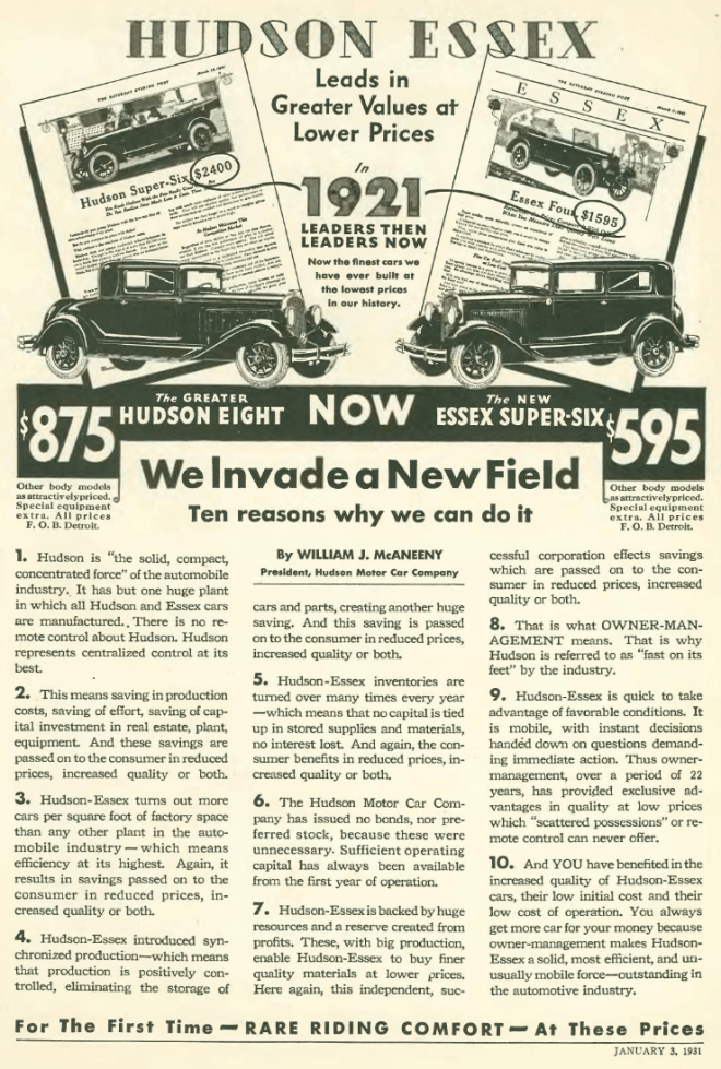 …the Hudson Motor Car Company is long gone, but in 1930 it was the third largest carmaker after Ford and Chevrolet, and instead of luxury it touted the affordability of its cars, especially its low-priced Essex line, priced $1,000 less than its predecessor from ten years earlier. The $595 Essex would be comparable to a $9,000 to $10,000 car today (by comparison, the 1931 Marmon or Imperial would set you back somewhere between $3,000 and $5,000, roughly equivalent to a $46,000 – $78,000 range today)…