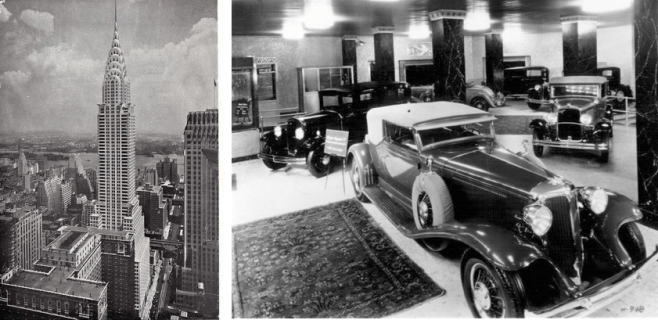 …over at the Chrysler Building, which served as that corporation’s headquarters from 1930 until the mid-1950s, new cars were on display on the building’s first two floors…
