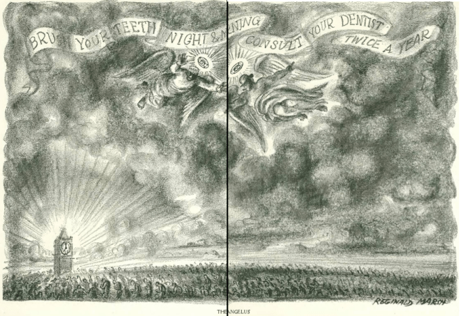 …and we close with our cartoonists…Reginald Marsh heralded the new year with this two-page spread depicting the heavens glorifying dental hygiene…