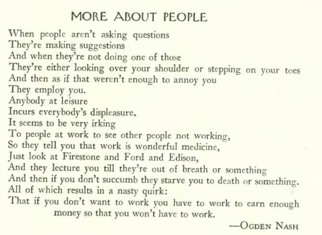 CRANKY COUPLETS…Ogden Nash lent his droll verse to the nation’s economic woes. In 1931, while working as an editor at Doubleday, Nash submitted a number of poems to the New Yorker and spent three months working on the magazine’s editorial staff. (poeticous.com)