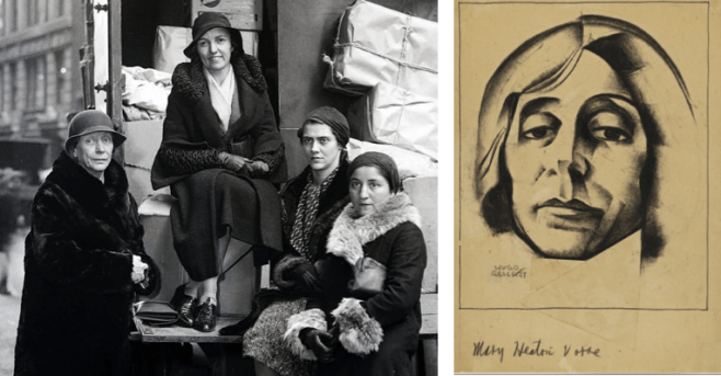 FOR THE CAUSE…Mary Heaton Vorse (left) with fellow activists preparing to leave on a relief expedition to aid striking Kentucky miners, 1932. At right, a 1925 drawing of Vorse by Hugo Gellert. (nysut.org/Smithsonian)