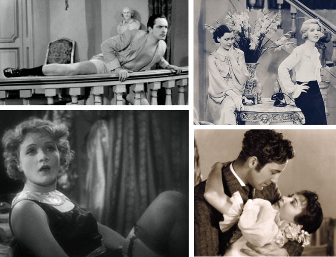 PRE-CODE WORLD…During a brief period of the early sound era, many films used both sex and violence to attract audiences to theaters. The Publix Theatres ad above implied that these three films had plenty of sex, or “it” — clockwise, from top left, Fredric March ran around in his skivvies in The Royal Family of Broadway (1930); Mary Brian and Ina Claire portrayed acting sisters Gwen and Julie Cavendish in The Royal Family of Broadway; David Manners and Ruth Chatterton shared an embrace in The Right to Love (1930); and Marlene Dietrich lured a schoolmaster into a life of madness and despair in The Blue Angel (1929-30).