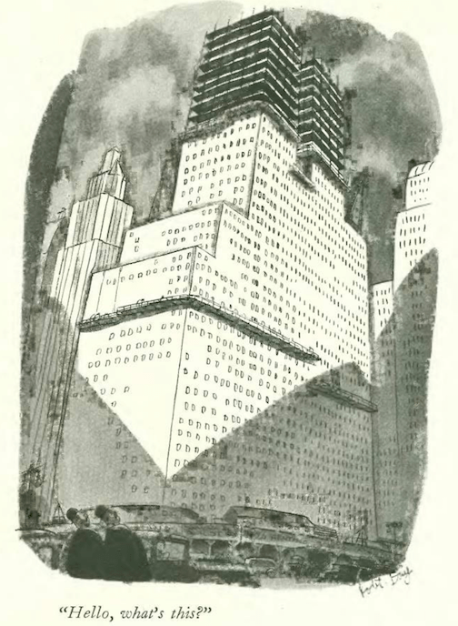 In his “Notes and Comment,” E.B. White questioned the need, and appropriateness, of a wood and plaster Federal Hall replica in Bryant Park, which at the time was a neglected patch of land behind the New York Public Library and a favorite spot for the city’s homeless, their numbers rapidly growing during one of the worst years of the Depression (unemployment hovered near 25 percent). Otto Soglow commented, via cartoon:
