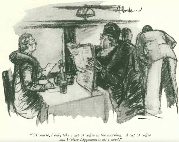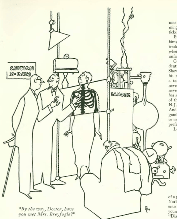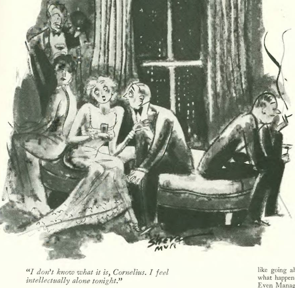 …on to our cartoons, we begin with Gardner Rea, borrowing from a running gag in the Marx Brothers’ 1930 film Animal Crackers, which featured Harpo chasing a sexy blonde around a mansion (apologies for the poor reproduction quality—the archival image was quite faint)…