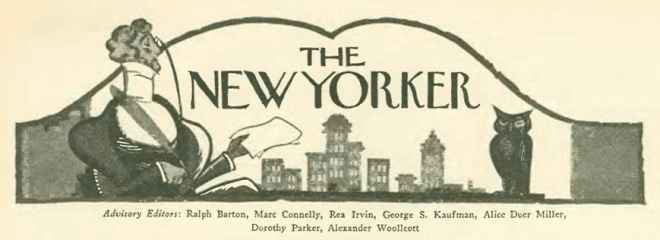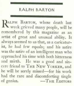 To lose a longtime contributor and friend must have been a real blow to the staff at The New Yorker. Barton had been there from the beginning, his name appearing on the magazine’s first masthead as an honorary advisory editor: