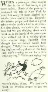 Attitudes toward drunken driving — or drunken flying — were very different 89 years ago. Case in point was this “Epitaph” written by Morris Markey marking the passing of Carter Leigh, who carried the air mail while flying under the influence (Reginald Marsh contributed the portrait) …
