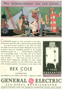 …if the cruise was too rich for your budget, perhaps you could put your money toward a durable good like a GE all-steel refrigerator. Note how GE contrasted its product with the overly complicated gadgets demonstrated on stage by popular vaudeville comedian Joe Cook…