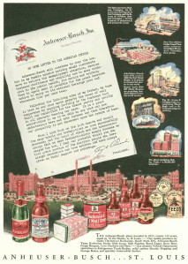 American brewers could sense the tide was turning on Prohibition laws, among them Augustus Busch, who took out a full page ad featuring “An Open Letter to the American People” that suggested a return to beer brewing would help relieve the unemployment situation caused by the Depression — note how the ad featured a variety of non-alcoholic products, but put the alcoholic beer at the head of the line…