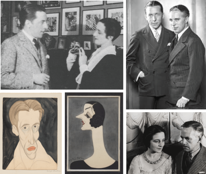 A CHARMED, TROUBLED LIFE…Clockwise, from top left, Ralph Barton with the love of his life, his third wife, actress Carlotta Monterey; Barton with best friend Charlie Chaplin, photographed by Nickolas Muray in 1927; after leaving Barton, Monterey would marry playwright Eugene O’Neill, who in a weird coincidence would become Chaplin’s father-in-law in 1943; a 1922 portrait of Carlotta by Barton; and a self-portrait from 1925, in the style of El Greco. “The human soul would be a hideous object if it were possible to lay it bare,” Barton wrote in 1926. (illustrationart.com/Pinterest/MCNY/curiator.com/npg.si.edu)