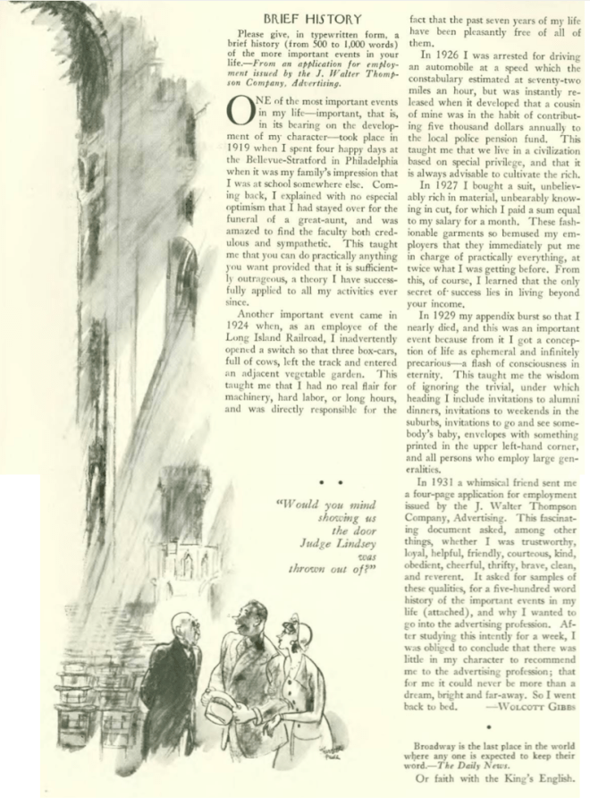 For his part, Hecht (1893-1964) contributed short fiction pieces to The New Yorker during its lean first years, 1925-1928. After the success of The Front Page, Hecht would go on to become one of Hollywood’s greatest screenwriters.