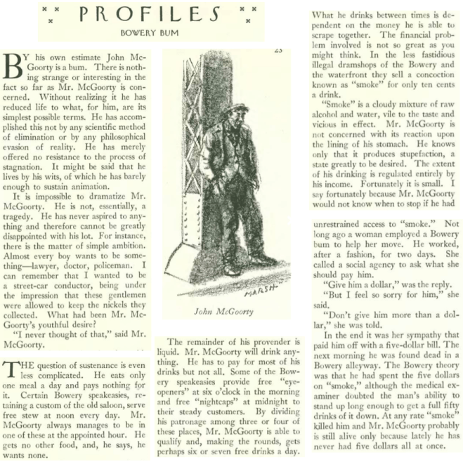 In his “Notes and Comment,” E.B. White questioned the need, and appropriateness, of a wood and plaster Federal Hall replica in Bryant Park, which at the time was a neglected patch of land behind the New York Public Library and a favorite spot for the city’s homeless, their numbers rapidly growing during one of the worst years of the Depression (unemployment hovered near 25 percent). Otto Soglow commented, via cartoon: