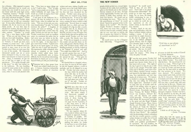 James Thurber penned this unusual July 30 profile, a parody of artistic genius- types who are loved and admired despite also being a drunken assholes. I include the opening paragraph, and the concluding paragraph, which follows a decision by Elliot Vereker’s literary friends to put him on a boat to France; during a farewell party he roundly insults them all.