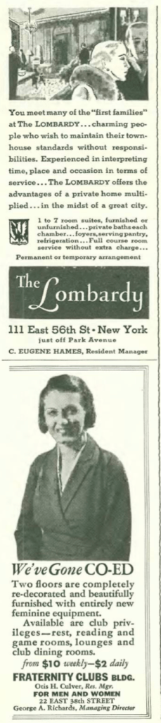 …back to our apartment hunting, The Lombardy was built in the 1920s by William Randolph Hearst for his movie star mistress Marion Davies…unlike Ten Park Avenue, it wasn’t on Park, but the ad makes sure to note its close proximity, and the illustration assured that the clientele were sufficiently dour in their good taste…also note the ad for the Fraternity Clubs Building, which was going co-ed…