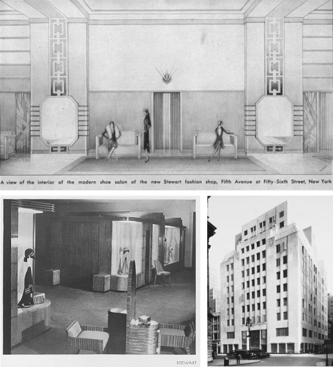 Clockwise, from top, artist rending of the Stewart women’s shoe department; Stewart and Company building at 721 5th Avenue; Stewart Millinery Shop. (Vogue/Museum of the City of New York, all via drivingfordeco.com)