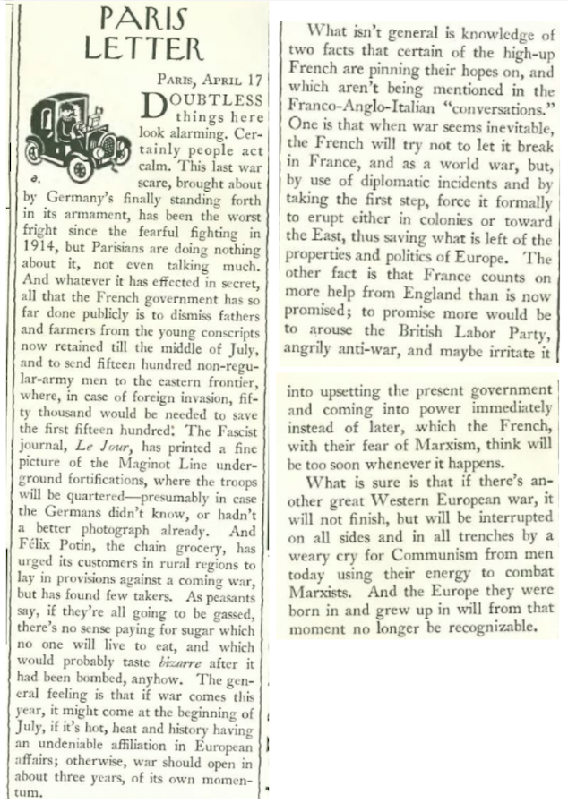 In her “Letter from Paris,” Janet Flanner was noting “increasing Fascist sentiment and sympathy” in her adopted city: