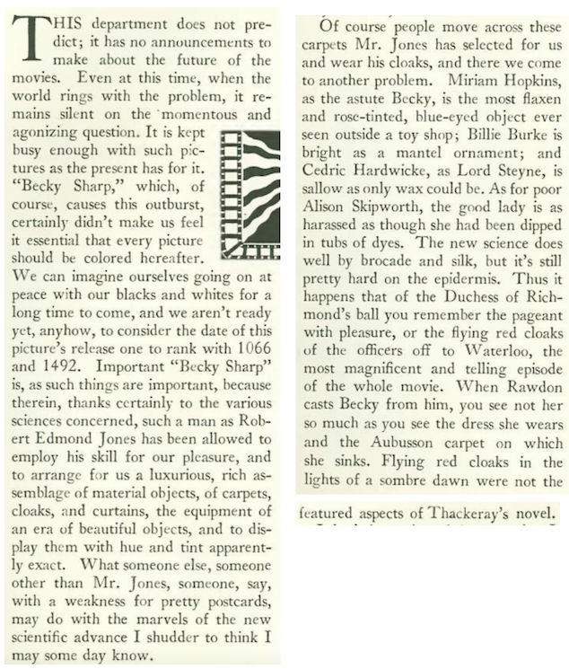 With a screenplay by Ben Hecht and Charles MacArthur and direction by Howard Hawks, one would hope for some rough and tumble in a film about Gold Rush San Francisco. Instead, Mosher found the trappings of Barbary Coast rather mild. This was doubtless due in part to the Hays Code that curtailed the sex and violence portrayed in films of the 1920s and early 1930s.
