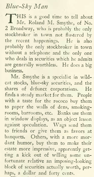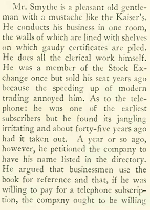 On the subject of stocks, “Talk” also featured this mini profile (written by Robert Coates) of Roland Mulville Smythe (1855-1930), who specialized in buying and selling old and obsolete stocks. Nicknamed “No Telephone” Smythe for his dislike of the device, he began his trade in obsolete securities and banknotes sometime around 1880…