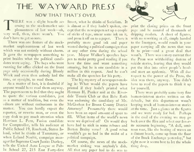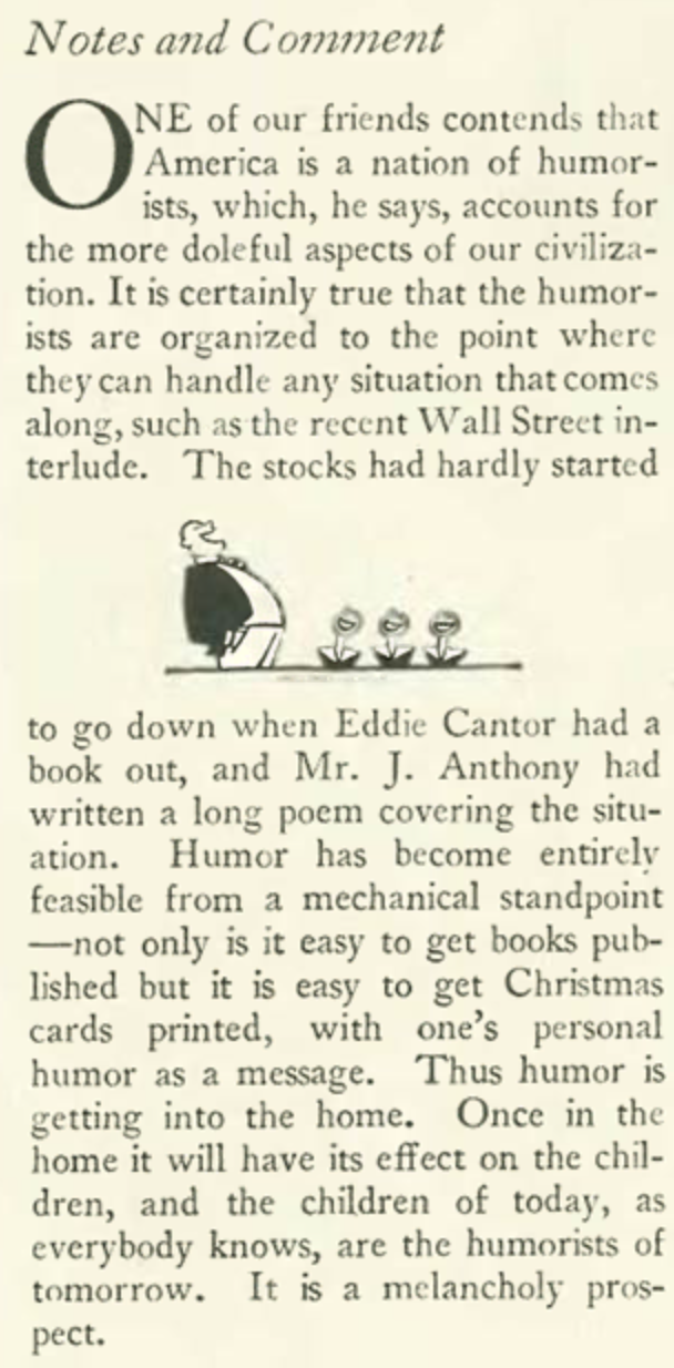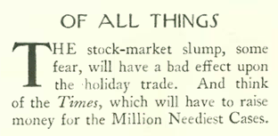 There was fear in the air, and a hint of doom, when E.B. White submitted his “Notes and Comment” section for the Nov. 2 issue. Having filed his column sometime between October 24 (“Black Thursday”) and October 29, 1929 (“Black Tuesday”), he weighed the mood of his city against the reassurances offered by politicians, bankers and pundits…
